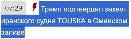 Президент США Дональд Трамп сообщил в социальной сети Truth Social, что американские военно-морские силы перехватили и взяли под контроль иранское грузовое судно TOUSKA в районе Ормузского пролива. По словам главы государства, судно пыталось проигнорировать введенную США морскую блокаду Ирана.
