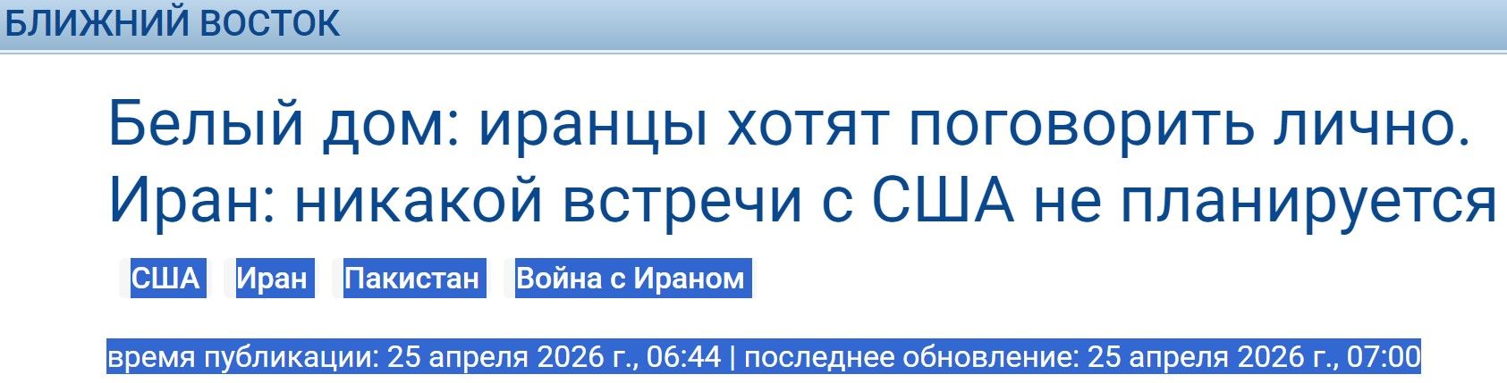 По данным СМИ, трехсторонняя встреча (Иран-США-Пакистан) или новый раунд интенсивного обмена сообщениями через посредников может состояться в понедельник, 27 апреля.