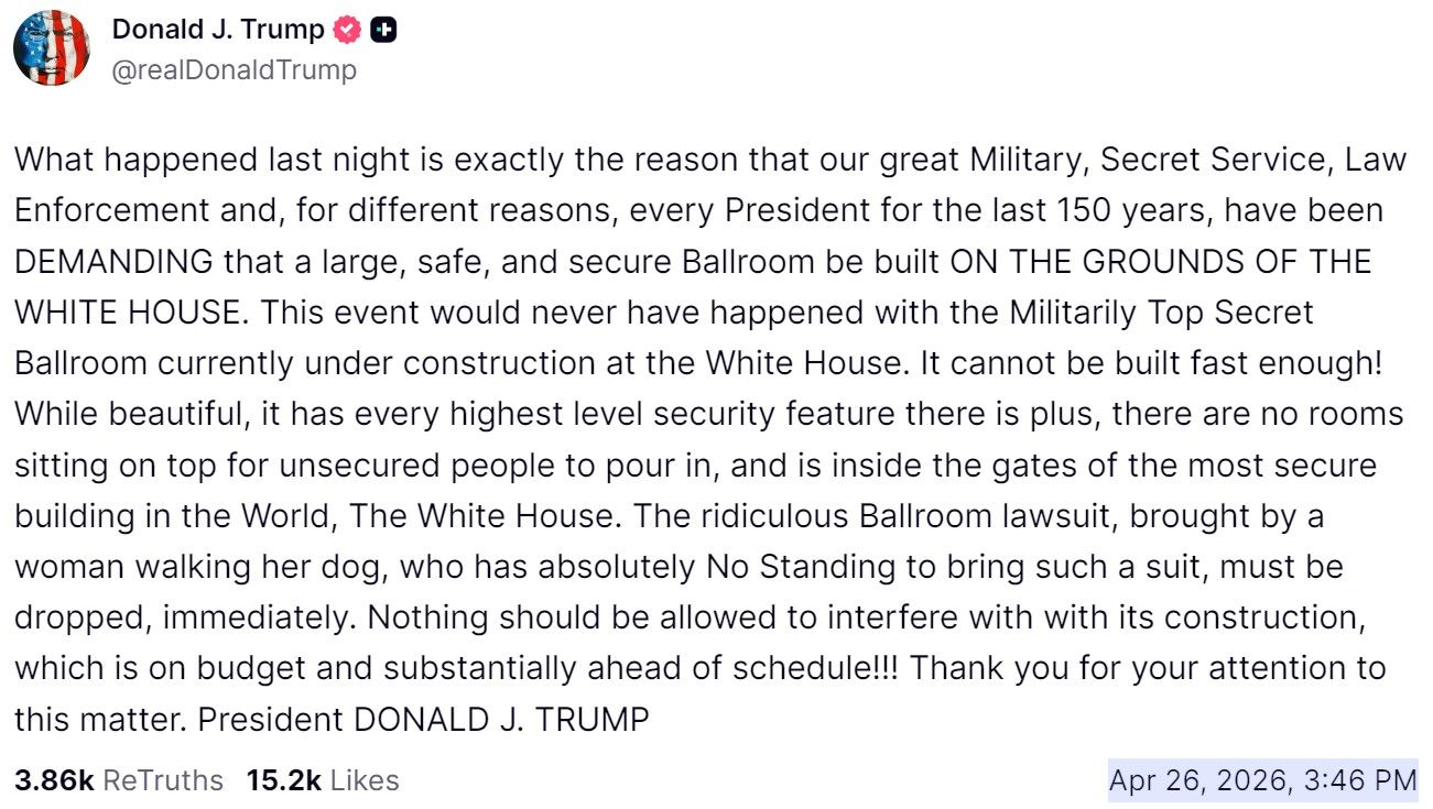 ИСТОЧНИК: Truth Social, Apr 26, 2026, 3:46 PM