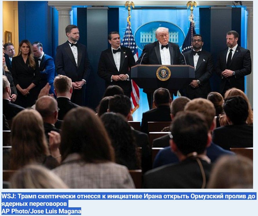 The Wall Street Journal сообщает со ссылкой на американских чиновников, что президент США Дональд Трамп и его команда по национальной безопасности скептически относятся к предложению Ирана открыть Ормузский пролив и отложить обсуждение ядерной программы на более поздний этап.