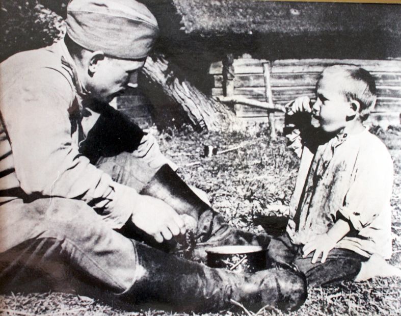 В этот момент мимо проходил, наверное, какой-то фронтовой корреспондент. Увидел он эту картину – солдата, угощающего своей кашей голодного ребёнка, и сфотографировал. Лёня взглянул на него лишь мельком. Хоть фотоаппарат, конечно, был штукой редкой, но чувство голода было куда как сильнее, чем детское любопытство.