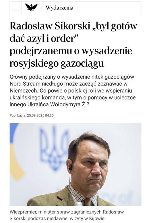 Министр иностранных дел Польши Радослав Сикорский в приватных разговорах допускал, что Варшава готова предоставить убежище украинцу Владимиру Ж., подозреваемому в подрыве «Северных потоков», и даже наградить его орденом.