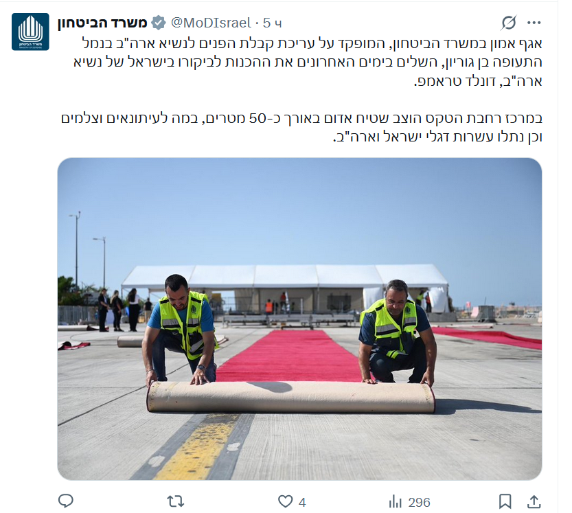Там были установлены трибуны для журналистов, развешаны десятки израильских и американских флагов, а также отдельно расстелена 50-метровая красная дорожка в зоне для приема американского лидера.