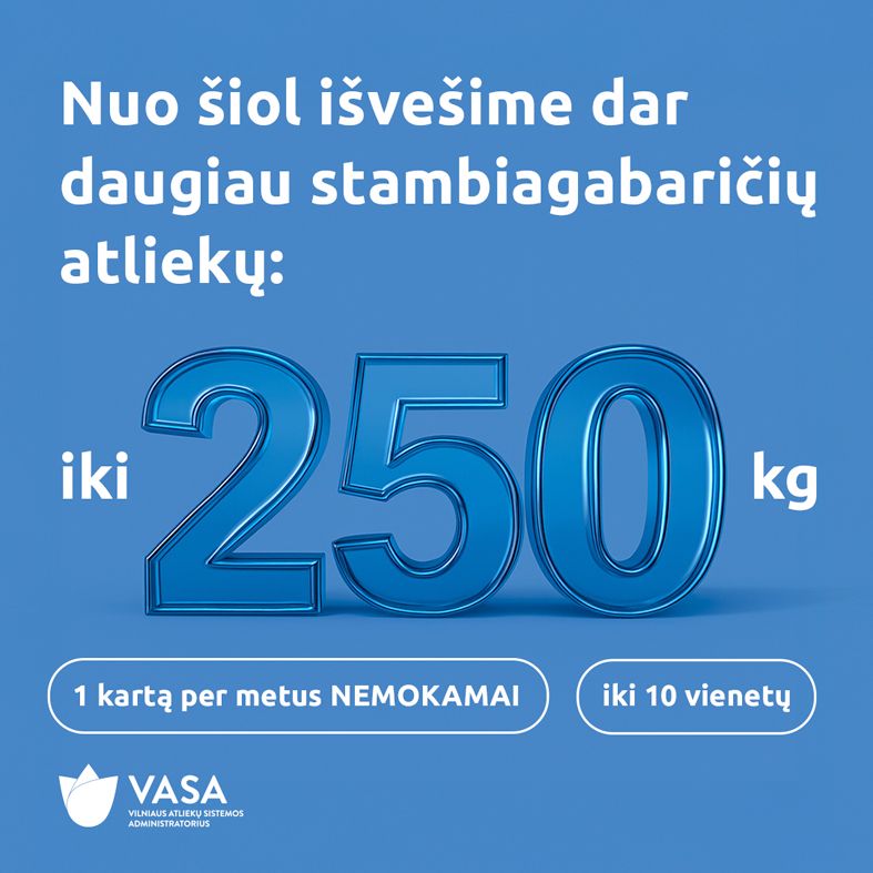 «Вильнюсский администратор вывоза отходов» (Vilniaus atliekų sistemos administratorius, VASA) сделал бесплатную услугу приёма крупногабаритного мусора ещё удобнее и эффективнее. Отныне жители за раз могут сдать больше отходов – количество принимаемых отходов увеличили до 250 кг, сообщает предприятие на своём сайте vasa.lt.