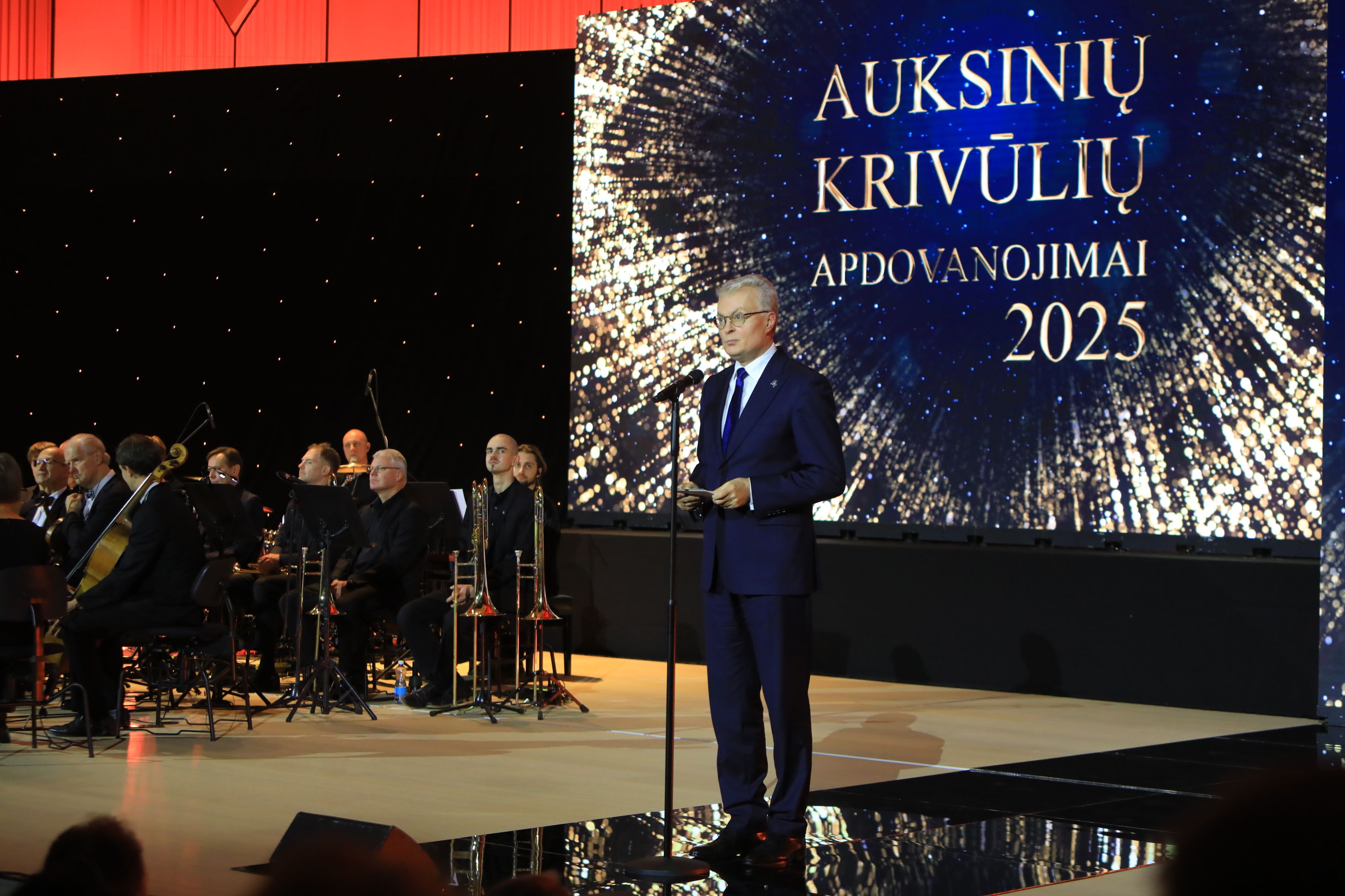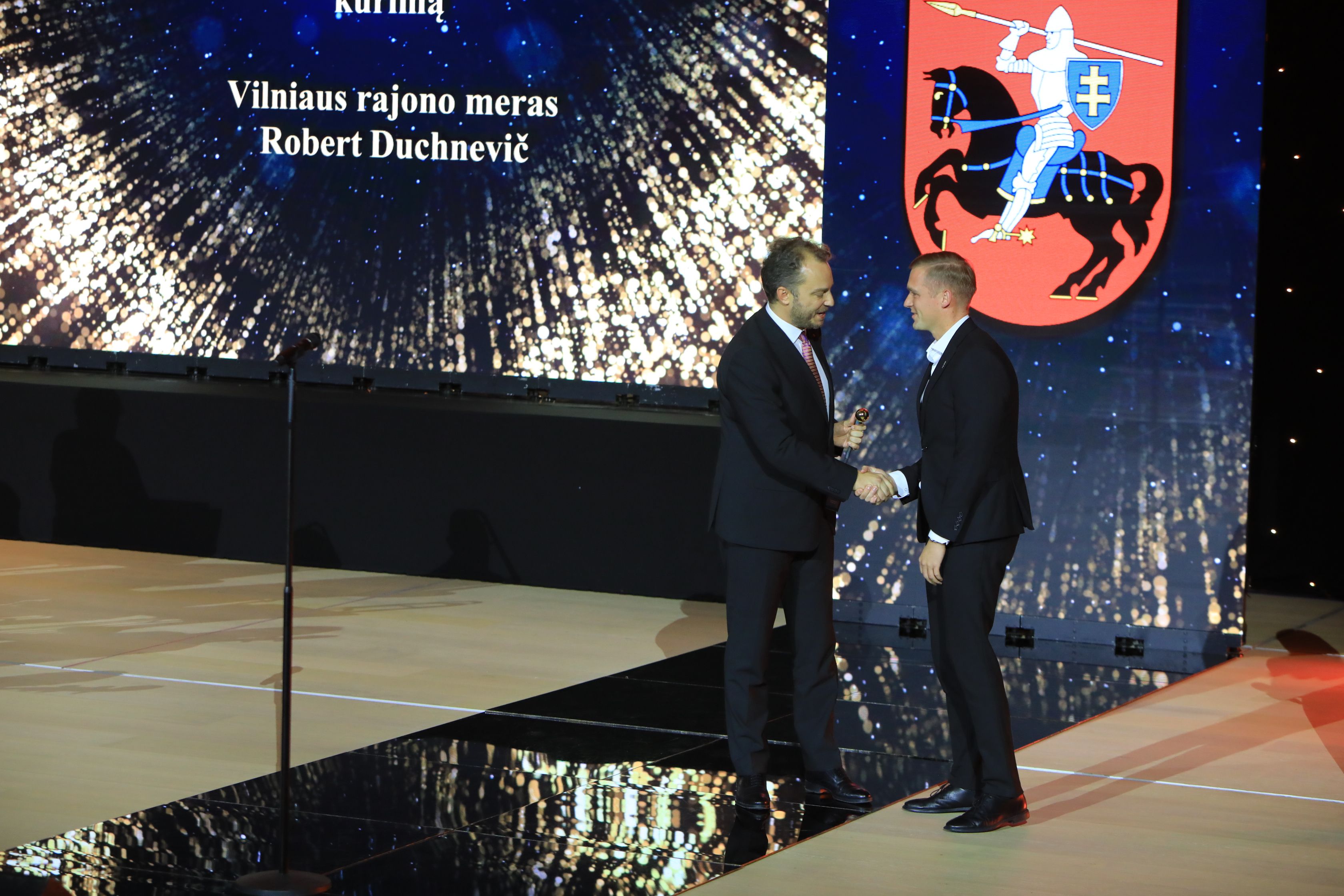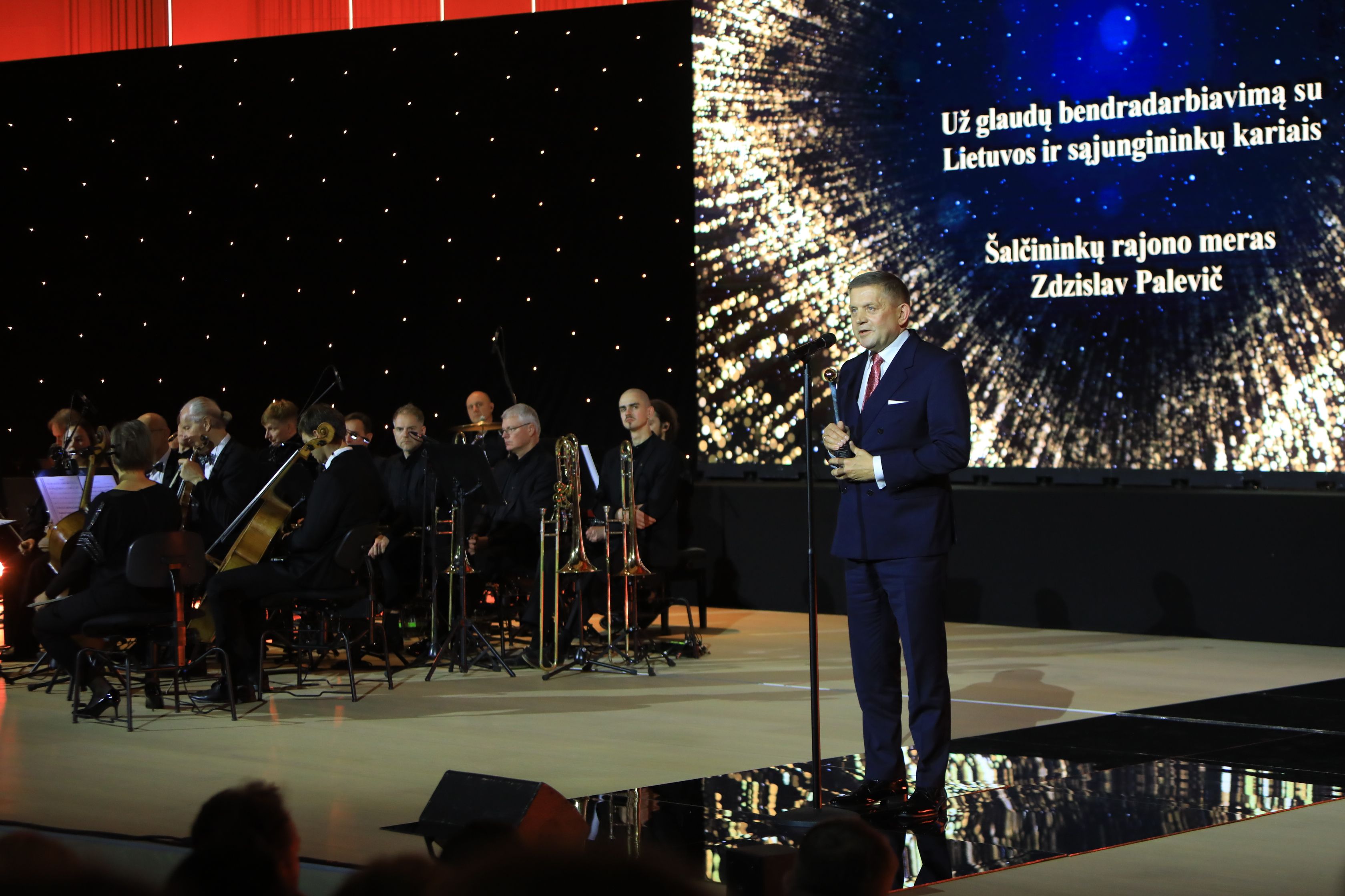 Чтобы поздравить мэров, членов муниципальных советов и работников самоуправлений, съехавшихся со всей страны в столицу Литвы, на церемонию «Золотого посоха» приехали также президент Литвы Гитанас Науседа, спикер Сейма Юозас Олекас и премьер-министр Инга Ругинене.