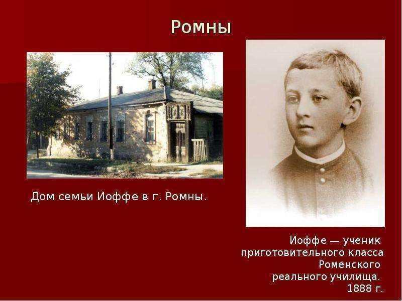 Иоффе Абрам Фёдорович (наст. имя Аврум Файвиш-Израилевич) – русский физик, родился 17 (29) октября 1880 года в уездном городке Ромны в семье купца второй гильдии Файвиша (Фёдора Васильевича) Иоффе и домохозяйки Рашели Абрамовны Вайнштейн. Он был старшим из пяти детей в семье. Семья у него была дружная и веселая.