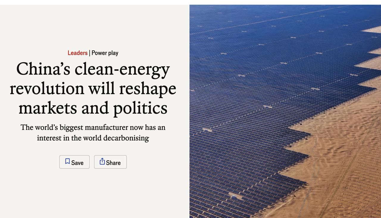 The Economist отмечает, что Китай стал «новым типом сверхдержавы» — энергетической. Он способен производить почти терават возобновляемых мощностей в год, что сопоставимо с 300 крупными атомными электростанциями. Благодаря масштабному производству себестоимость энергии постоянно снижается, а внутренний спрос стимулирует дальнейший рост.