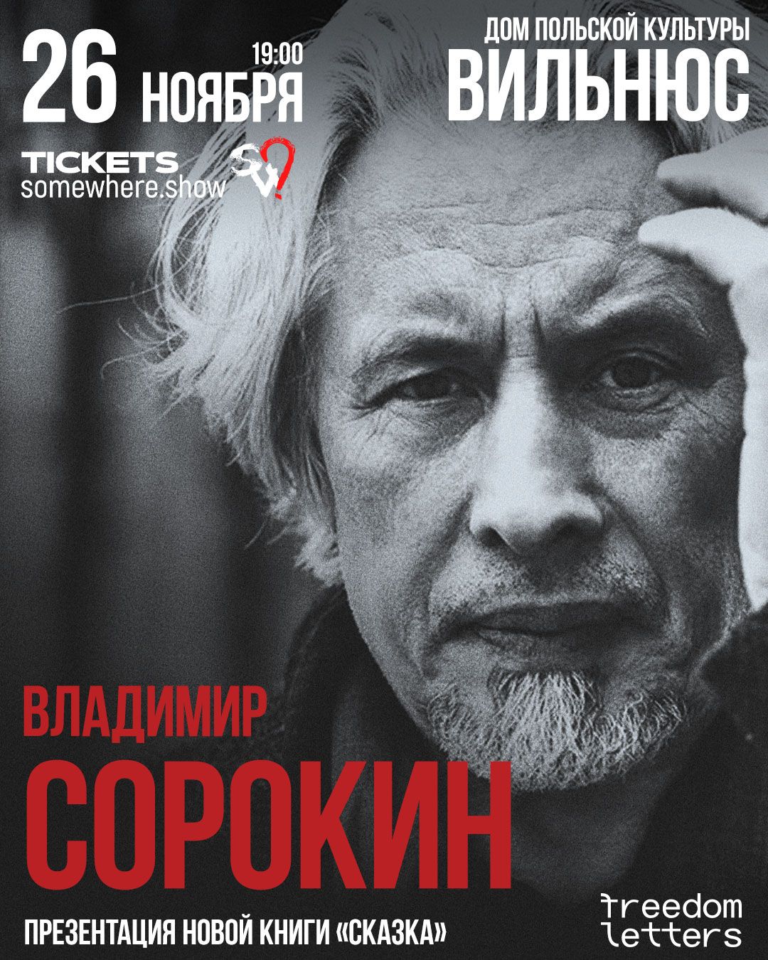 26 ноября в Вильнюсе состоится встреча с Владимиром Сорокиным — одним из самых известных и влиятельных писателей современной русской литературы, автором книги года — бестселлера «Сказка». В программе вечера — чтение фрагментов романа, разговор с публикой и автограф-сессия.
