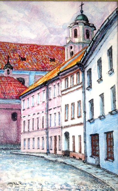 Для старожилов Вильнюса, наверняка, будет интересным уточнение: за заднем фоне видна часть костёла Всех святых, а неподалёку, уже за рамками этой картины, когда-то был кинотеатр «Аушра».
