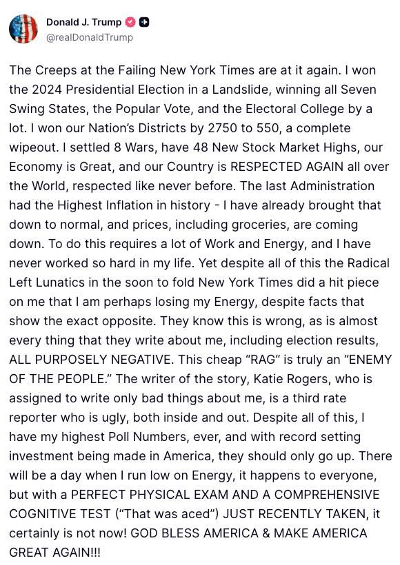 В Truth Social Трамп написал, что «никогда не работал так много», а фраза о потере энергии – ложь. Трамп назвал NYT «врагом народа», а автор материала Кэти Роджерс – «третьесортной журналисткой, некрасивой внутри и снаружи».