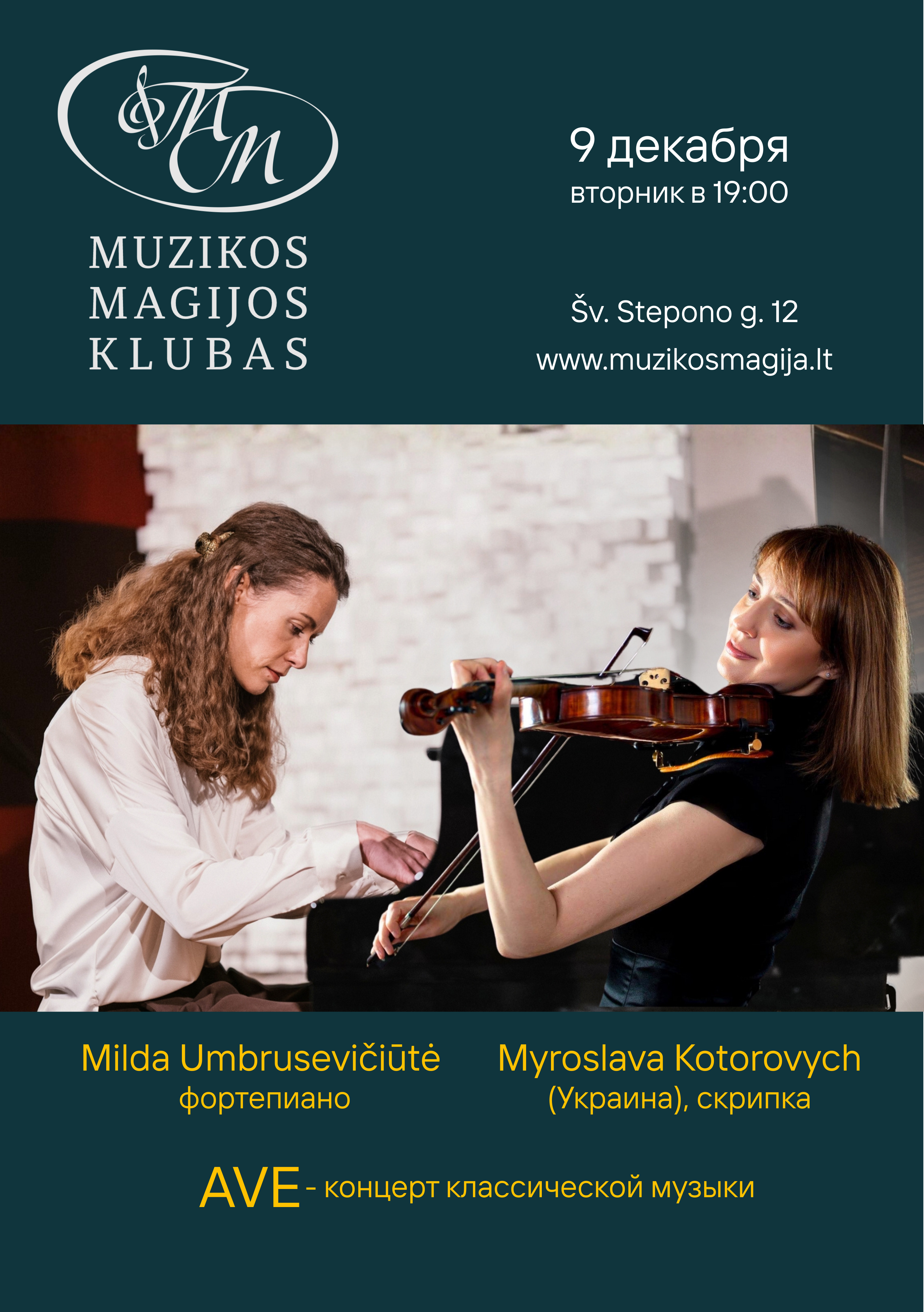 Дуэт, отличающийся тонким исполнением произведений, очаровывающей магией музыки слушателей, – скрипачка из Украины Мирослава Которович и пианистка Милда Умбрусевичюте - подготовил чувственную программу, основу которой составляют шедевры И. С. Баха и Ф. Шуберта, связь которых со слушателем остается живой до сих пор.