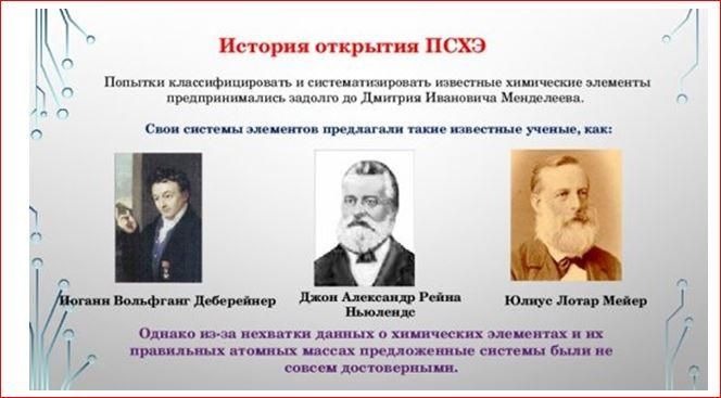 Попытки систематизации многочисленных известных элементов и соединений, начатые Дёберейнером, продолжили многие химики, особенно во второй половине XIX в. Б. Шанкартуа в 1862 г. расположил элементы в порядке возрастающих атомных масс по винтовой линии на поверхности цилиндра. В 1857 г. У. Одлинг опубликовал таблицу, в которой элементы были также расположены в порядке возрастания их атомных масс. В 1863-1865гг. Дж. Ньюлендс пытался установить закономерность взаимного расположения элементов - так называемый "закон октав", и на его основе опубликовал таблицу элементов.