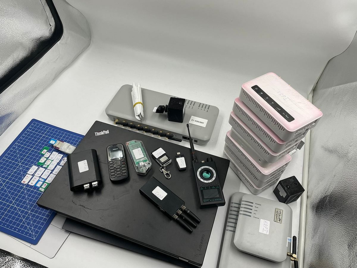 Полиция изъяла ряд предметов, включая детектор шпионских устройств, современное хакерское оборудование, антенны, ноутбуки, большое количество SIM-карт, маршрутизаторы, портативные жесткие диски и камеры.