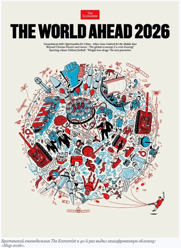 В преддверии Нового года британский еженедельник The Economist в 40-й раз выдал зашифрованную обложку: «Мир-2026». Журнал считают рупором Ротшильдов, старейшего финансового клана планеты. Ведь спонсирует его холдинговая компания E. L. Rothschild. Председатель правления - влиятельная бизнесвумен Линн Форестер, вдова Эвелина Роберта де Ротшильда, одного из членов семьи. Главный редактор Занни Минтон Беддоус - постоянная участница закрытых заседаний Бильдербергского клуба, который называют тайным мировым правительством. Поэтому обложки-шарады The Economist вызывают большой интерес публики.