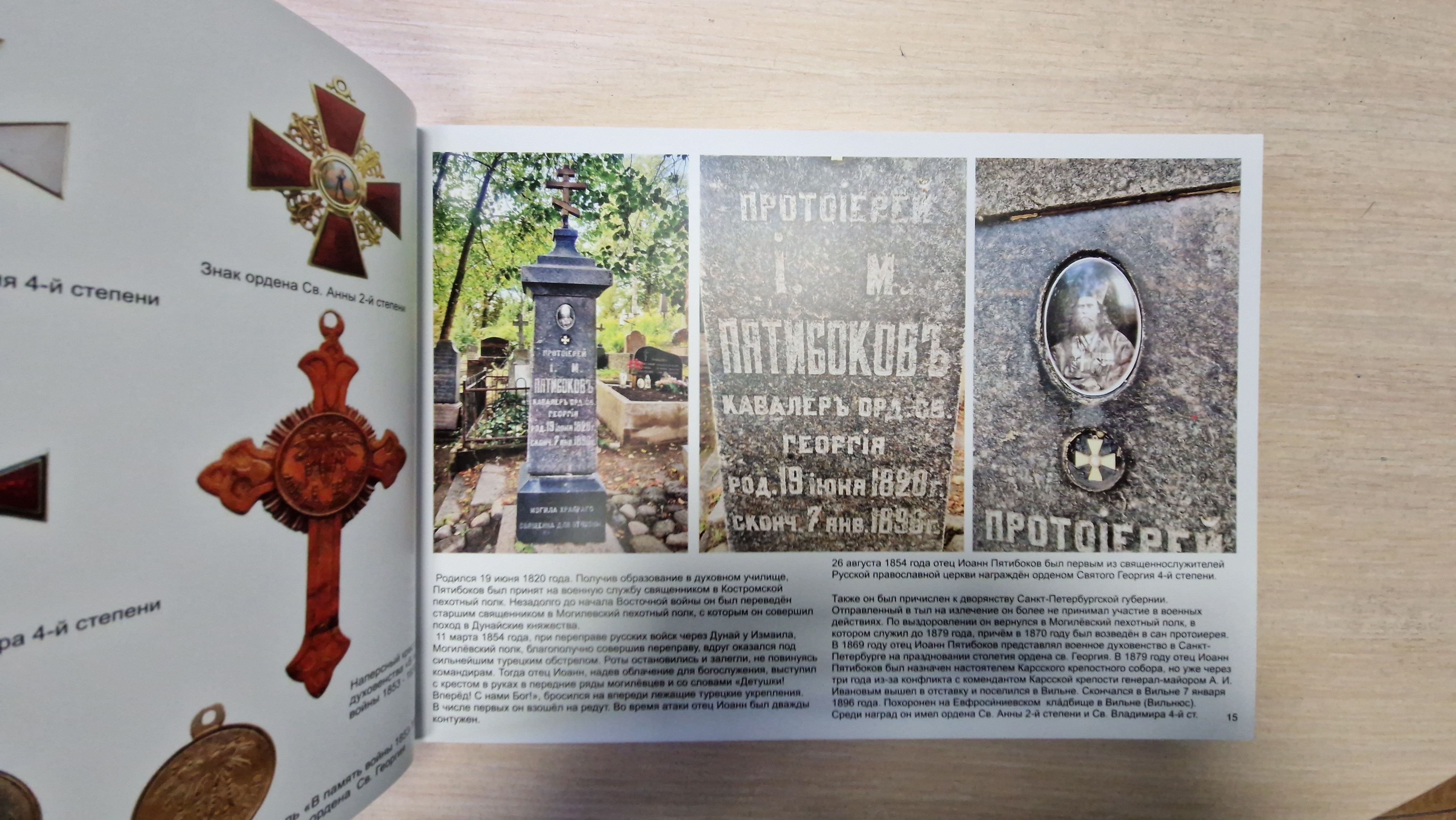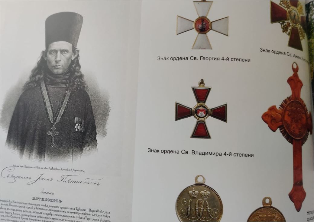 – Историческая литература почти не даёт сведений о медалях духовенства, поэтому большую часть идентификаций провёл я сам. Например, мне удалось установить, что Иоанн Матвеевич Пятибоков, один из награждённых, причём неоднократно, служил и похоронен в Вильнюсе, на Евфросиньевском кладбище, – отмечает С.Бусарев. – 11 марта 1854 года при переправе русских войск через Дунай у Измаила Могилёвский полк, переправившись, попал под сильнейший турецкий обстрел. Роты остановились и залегли. Тогда отец Иоанн, надев облачение для богослужения, выступил с крестом в руках в передние ряды могилёвцев и, воскликнув «Детушки! Вперёд! С нами Бог!», бросился на лежащие впереди турецкие укрепления. Он одним из первых взошёл на редут и был дважды контужен. 26 августа 1854 года отец Иоанн Пятибоков стал первым из священнослужителей Русской православной церкви, награждённым орденом Святого Георгия 4-й степени.