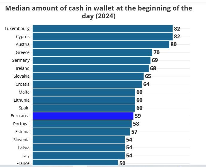 По данным опроса Европейского центрального банка (ЕЦБ), по состоянию на 2024 год медианный размер наличности, которую жители еврозоны держат в кошельках, составляет €59. Этот показатель заметно различается: от €35 в Нидерландах до €82 в Люксембурге и на Кипре.