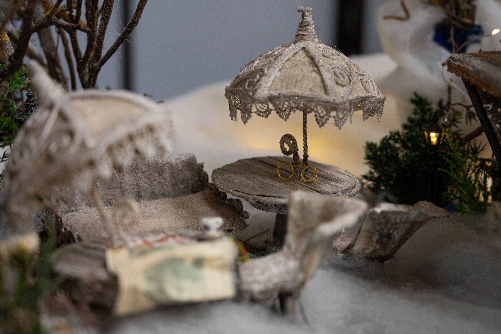 В деревеньке много винтажных миниатюр: кукольная мебель 1925 г., маленькие медные подсвечники, церковный колокол из настоящей меди. Такие вещи художница находит на блошиных рынках, иногда их привозят друзья из-за границы. В окне книжного магазина красуется уменьшенная газета 1936 г., изготовленная на состаренной бумаге по оригиналу.