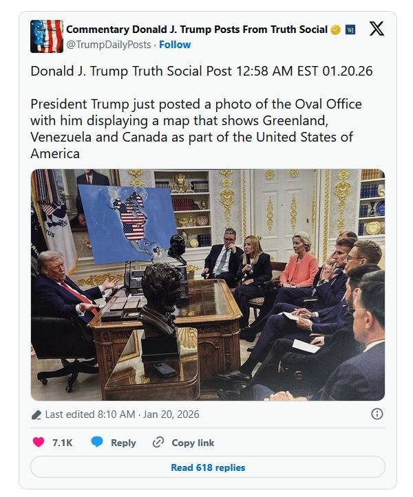 Пока что Трамп не демонстрирует никаких признаков отказа от своей программы аннексии. Ночью он опубликовал измененную в цифровом формате фотографию прошлогодней встречи с европейскими лидерами, включая фон дер Ляйен, в Белом доме. На новой версии Трамп сидит рядом с картой, на которой Гренландия, Канада и Венесуэла изображены как территория США.