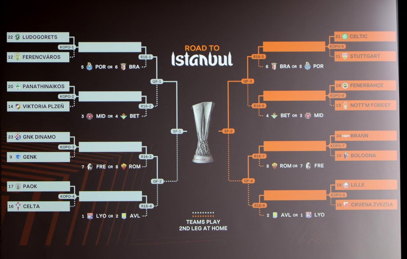 В других парах сыграют болгарский "Лудогорец" и венгерский "Ференцварош", хорватское "Динамо" из Загреба и бельгийский "Генк", шотландский "Селтик" и германский "Штутгарт", норвежский "Бранн" и итальянская "Болонья", греческий "Панатинаикос" и чешская "Виктория Пльзень", турецкий "Фенербахче" и английский "Ноттингем", французский "Лилль" и сербская "Црвена Звезда".