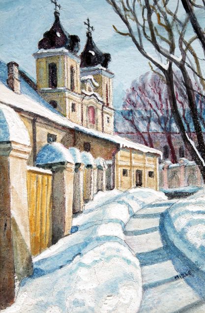 В Вильнюсе, например, таким скромником можно назвать костёл Святого Креста (на снимке), запечатлённый в своё время вильнюсским художником Леонидом Мироненко.