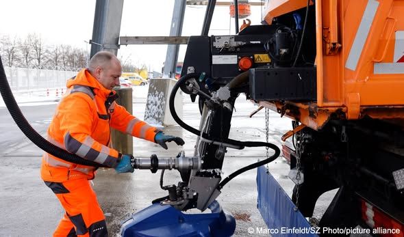 Поставщиком для местных коммунальщиков стал завод по производству маринованных овощей под Мюнхеном. Во время консервирования огурцы на некоторое время погружают в рассол - после этого его утилизируют. На заводе задумались, как можно использовать огуречный рассол повторно. Совместные с Минтрансом Баварии испытания показали, что он отлично справляется со льдом, если увеличить концентрацию соли.