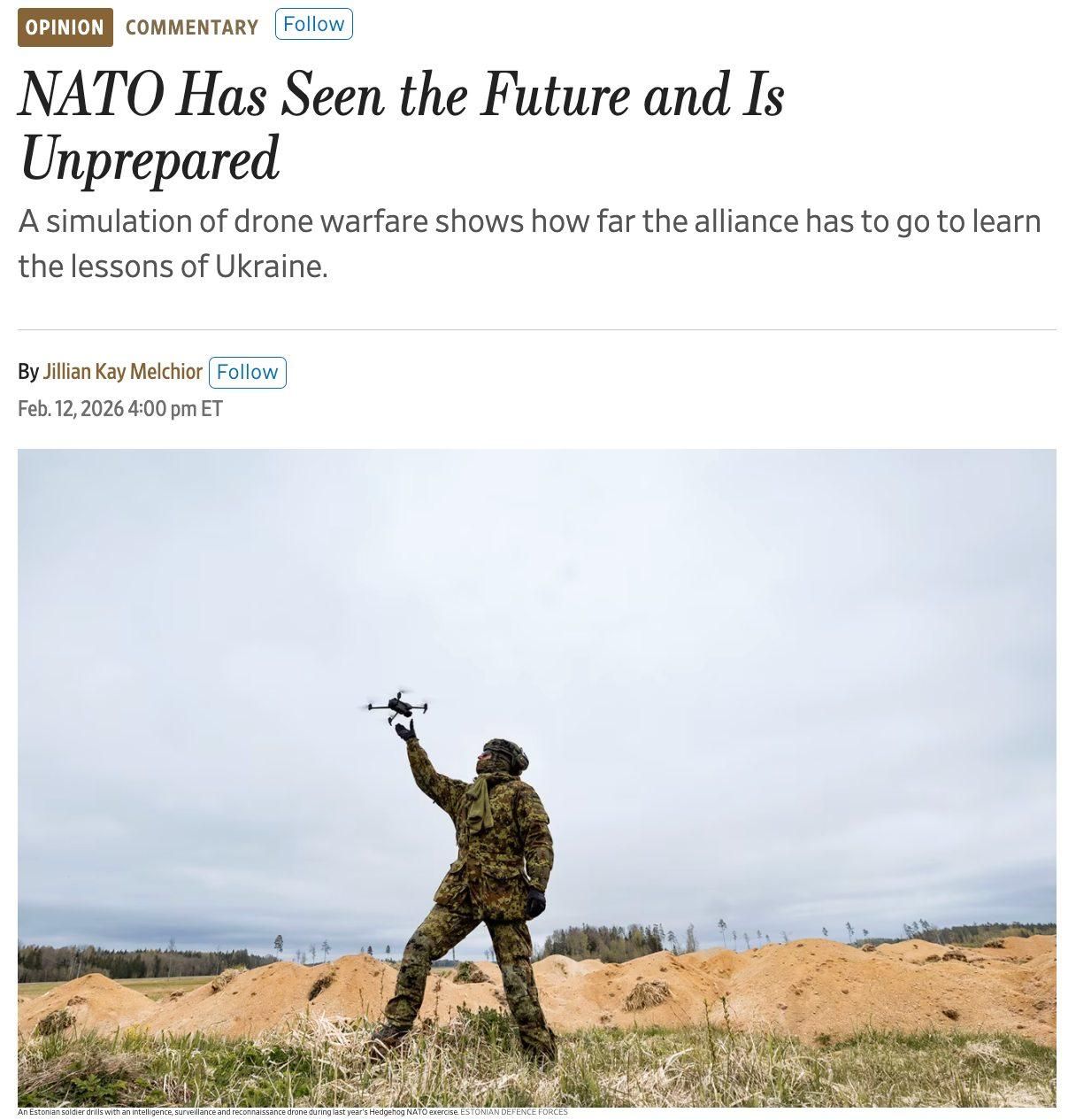 Колумнист издания Джиллиан Кей Мельхиор отмечает, что во время учений Hedgehog-2025 в Эстонии украинские военные показали, что армии НАТО не готовы к современной войне дронов. В маневрах участвовали более 16 тысяч военных из 12 стран Альянса.