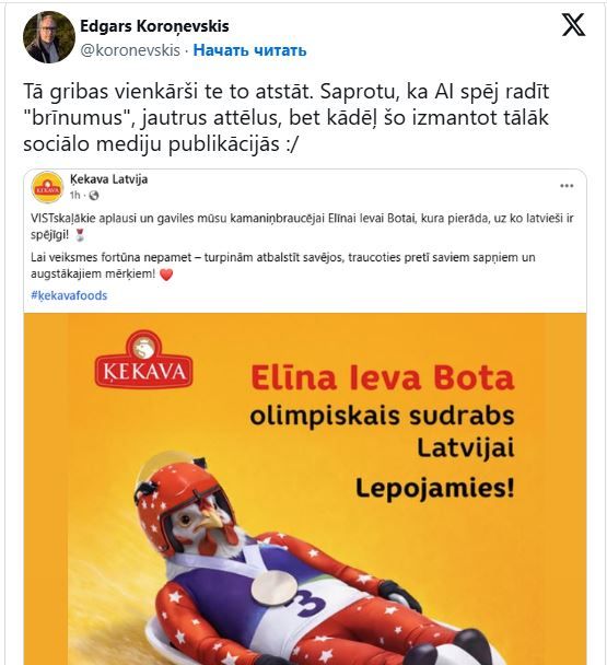 Страна взорвалась поздравлениями, но один из постов в Facebook вызвал не гордость, а оторопь. Компания «Ķekava Latvija» решила отметить успех спортсменки, однако креативный отдел явно переусердствовал.