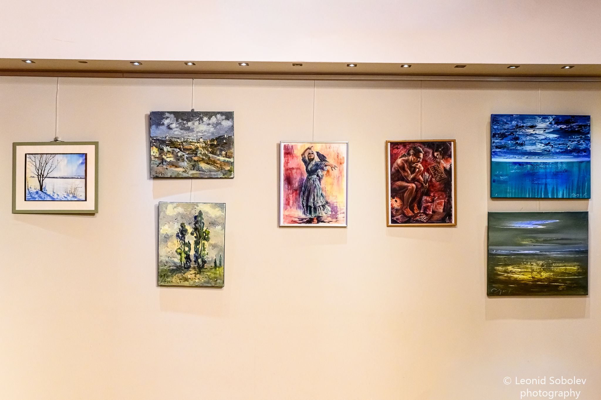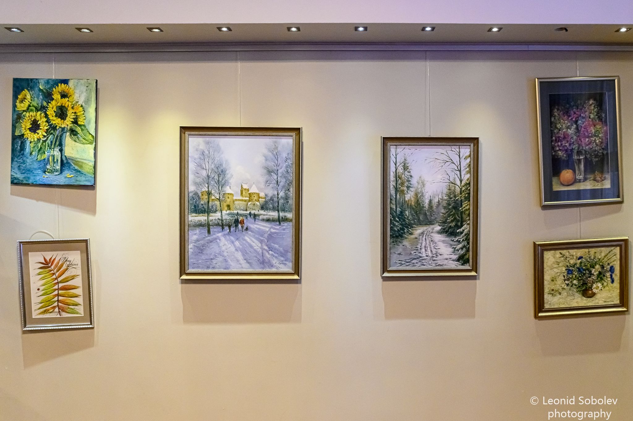 Зал, утопающий в приглушённом свете, словно превратился в сокровищницу красок. На стенах — полотна, каждое из которых — окно в душу автора. Здесь соседствуют мастерство академиков Белорусской художественной академии и искренность местных талантов. Линии и цвета, формы и оттенки сплетаются в единый диалог, где нет границ, а есть только общее пространство творчества.