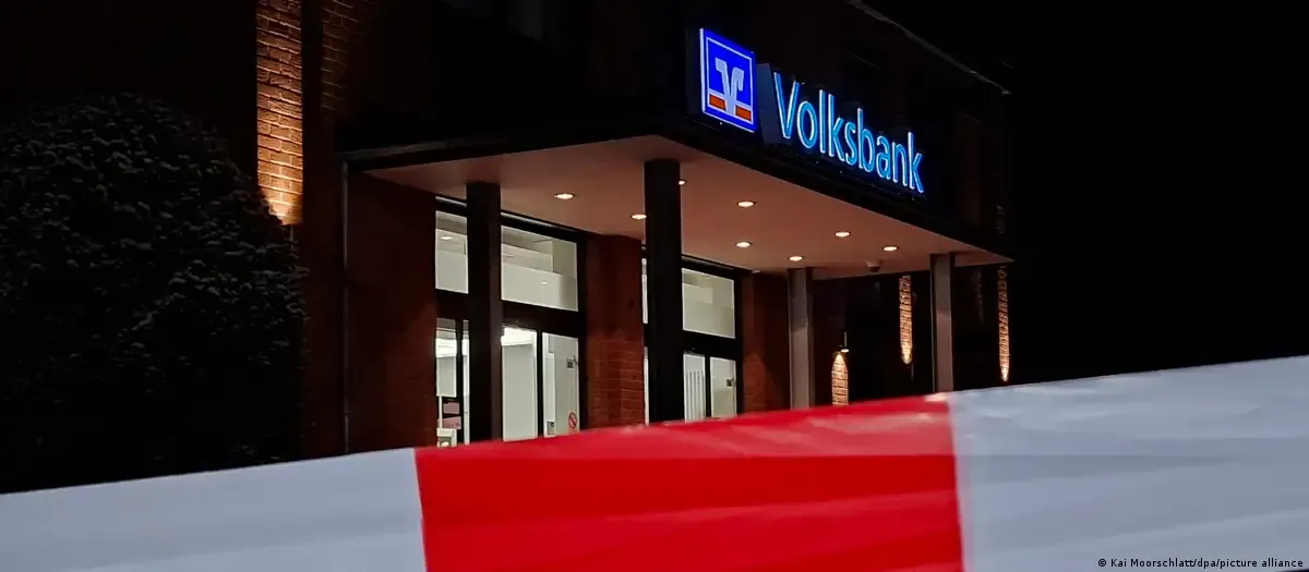 Вход в филиал банка Volksbank в городе Штур после ограбления. Фото: Kai Moorschlatt/dpa/picture alliance