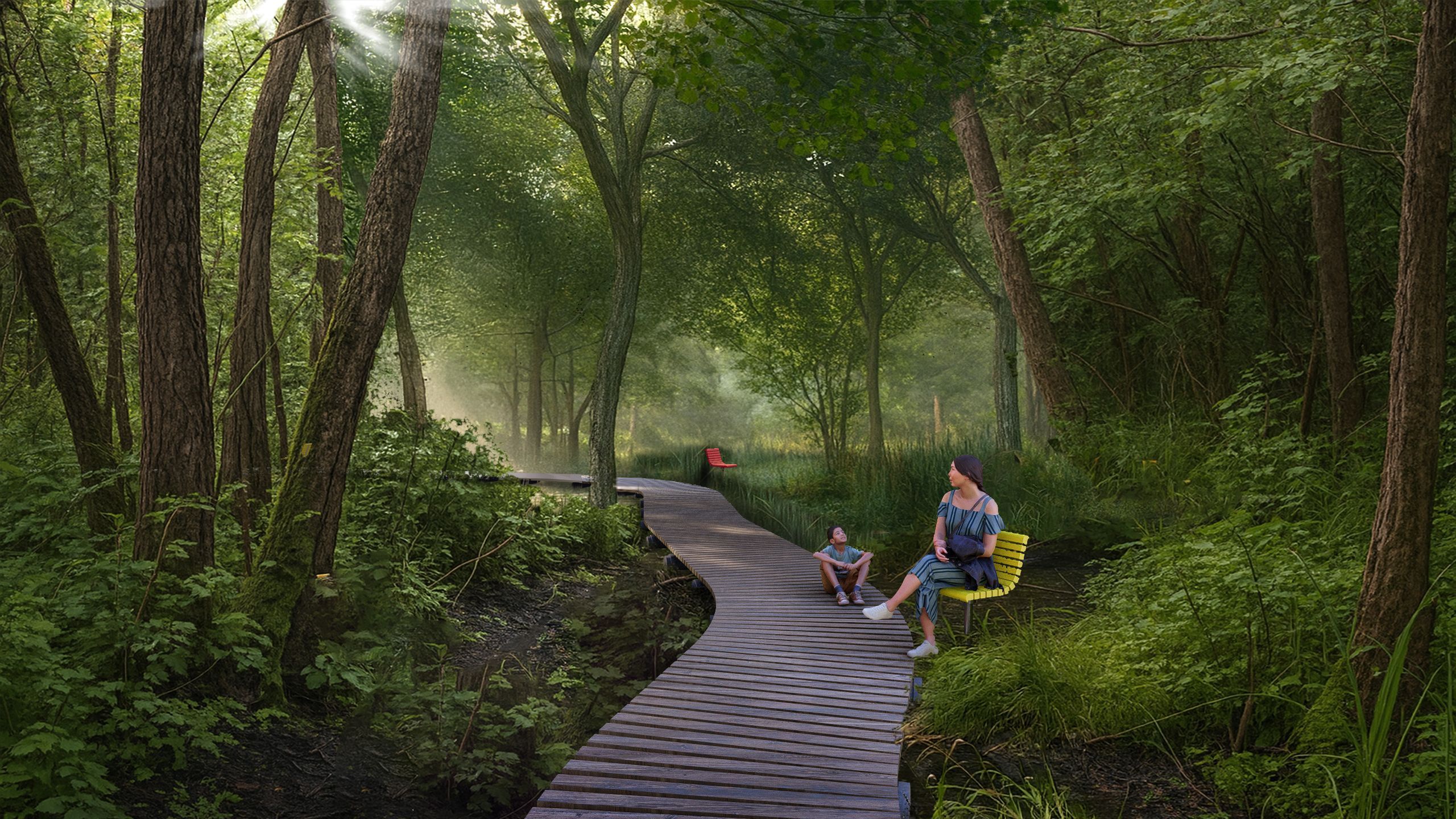 Территорию вокруг двух прудов в центре микрорайона Салининкай планируется превратить в парк для отдыха и изучения природы. На участке между двумя школами планируется проложить удобные пешеходные дорожки, установить понтонные террасы на воде и образовательные тропы в лесу, а также создать отдельную игровую площадку для детей и луг для общественных собраний.