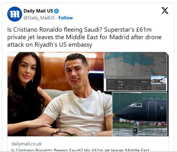 Эр-Рияд, где Роналду живет со своей невестой Жоржиной Родригес и пятью детьми, стал объектом иранских атак прошлой ночью, причем одной из целей было посольство США.