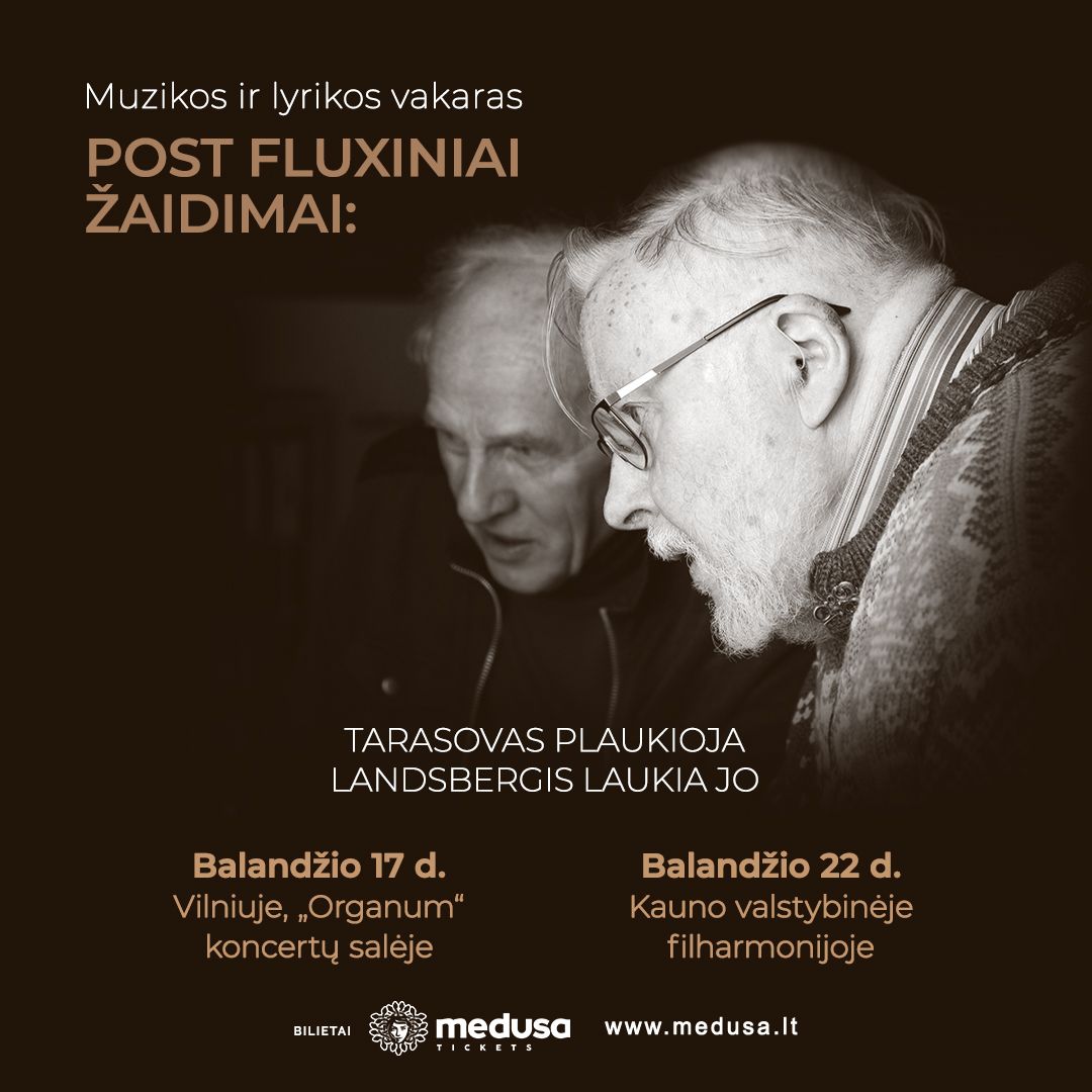 Под авангардным названием «Post Fluxiniai žaidimai: Tarasovas plaukioja, Landsbergis laukia jo» скрывается особый проект – вечер музыки и текстов, во время которого профессор Витаутас Ландсбергис читает свои стихи, а Владимирас Тарасовас наполняет их чарующими звуками ударных инструментов.