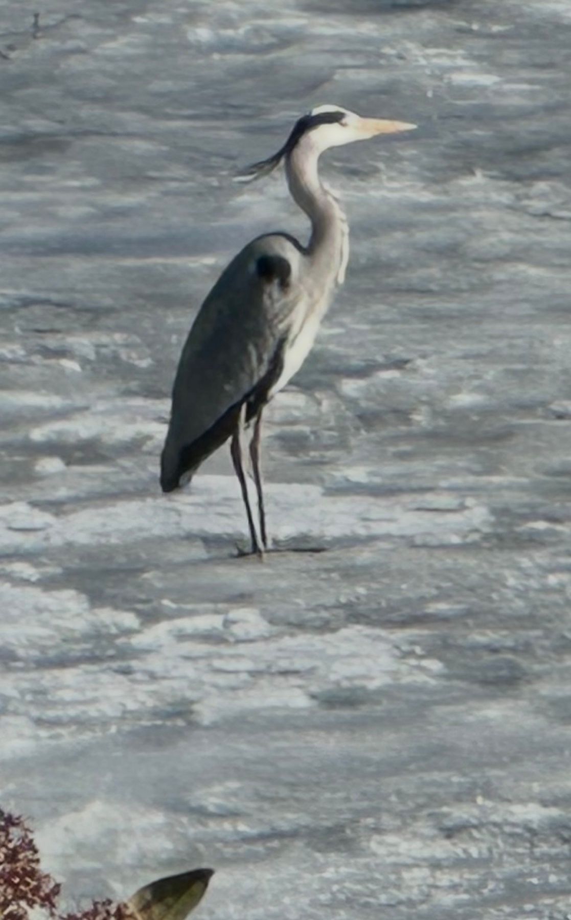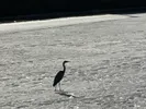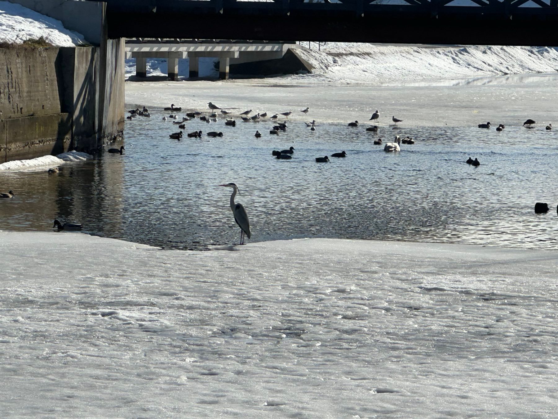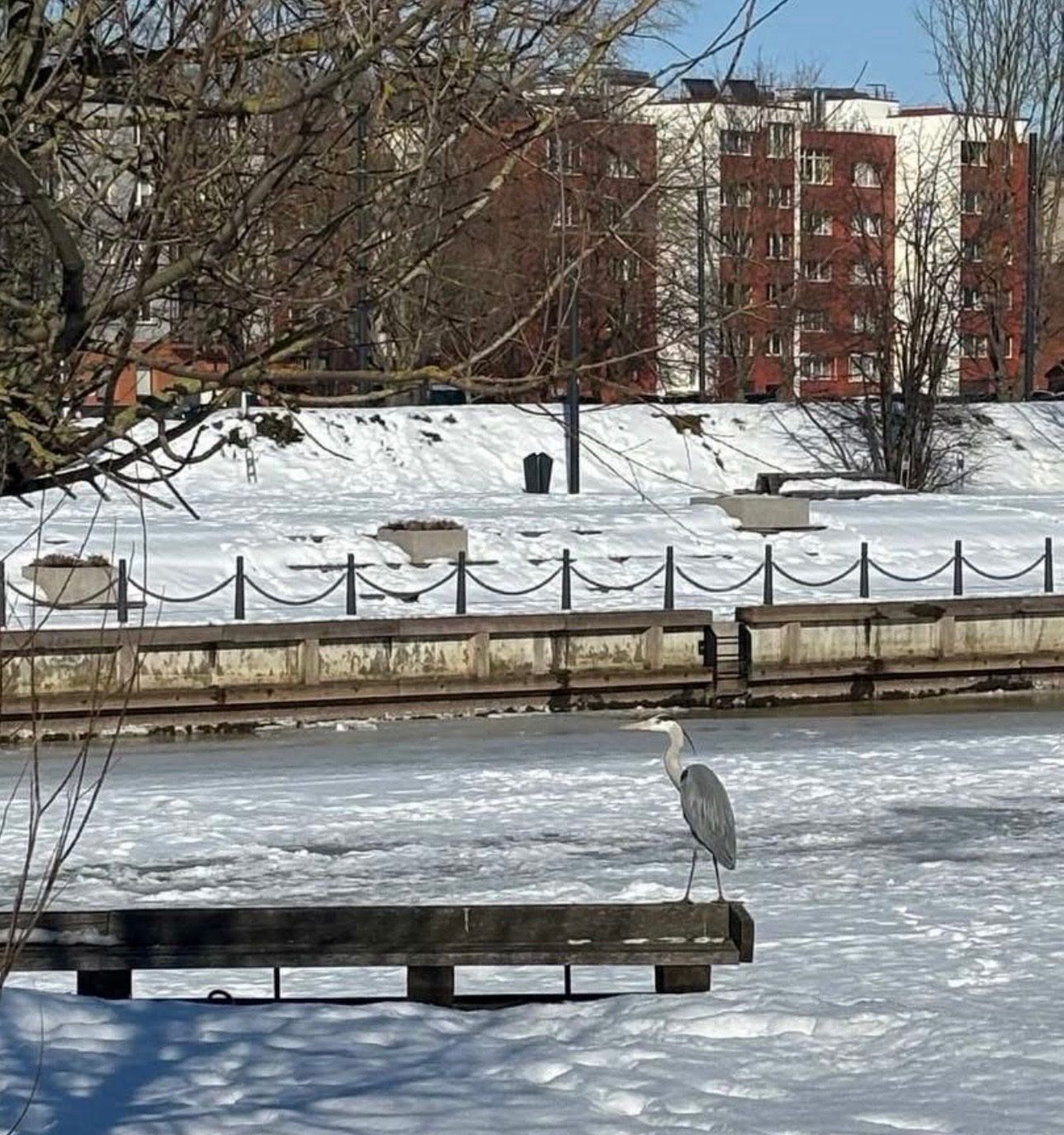 В самом центре города журавль величественно в олиночку расхаживал по льду от парусника «Меридианас» до горки Йонаса. Иногда перелетал с места на место.