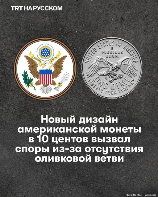 Монетный двор США представил новый дизайн в честь 250-летия страны. Среди обновлений — измененный дизайн 10-центовой монеты (дайма), с которой исчезла традиционная оливковая ветвь, долгое время служившая символом мира.