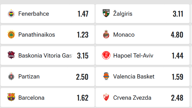 Турнирное положение: 1. «Фенербахче» - 23 победы, 2. «Олимпиакос» - 22, 3. «Реал» - 22, 4. «Валенсия» - 21, 5. «Хапоэль» - 20, 6. «Жальгирис» - 20, 7. «Панатинаикос» - 20, 8. «Барселона» - 20, 9. «Црвена Звезда» - 19, 10. «Монако» - 19, 11. «Маккаби» - 17, 12. «Дубай» - 17, 13. «Милан» - 17, 14. «Партизан» - 14, 15. «Бавария» - 14, 16. «Виртус» - 13, 17. «Париж» - 12, 18. «Баскония» - 10, 19. «Анадолу Эфес» - 10, 20. АСВЕЛ – 8.