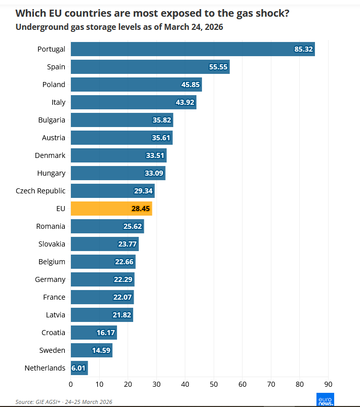По данным Kyos European Gas Analytics, подземные хранилища газа на 24 марта были заполнены всего на 28,4%, или 325 тераватт-часов, что на 5 процентных пунктов ниже показателя год назад и заметно ниже средних сезонных значений за последние пять лет.