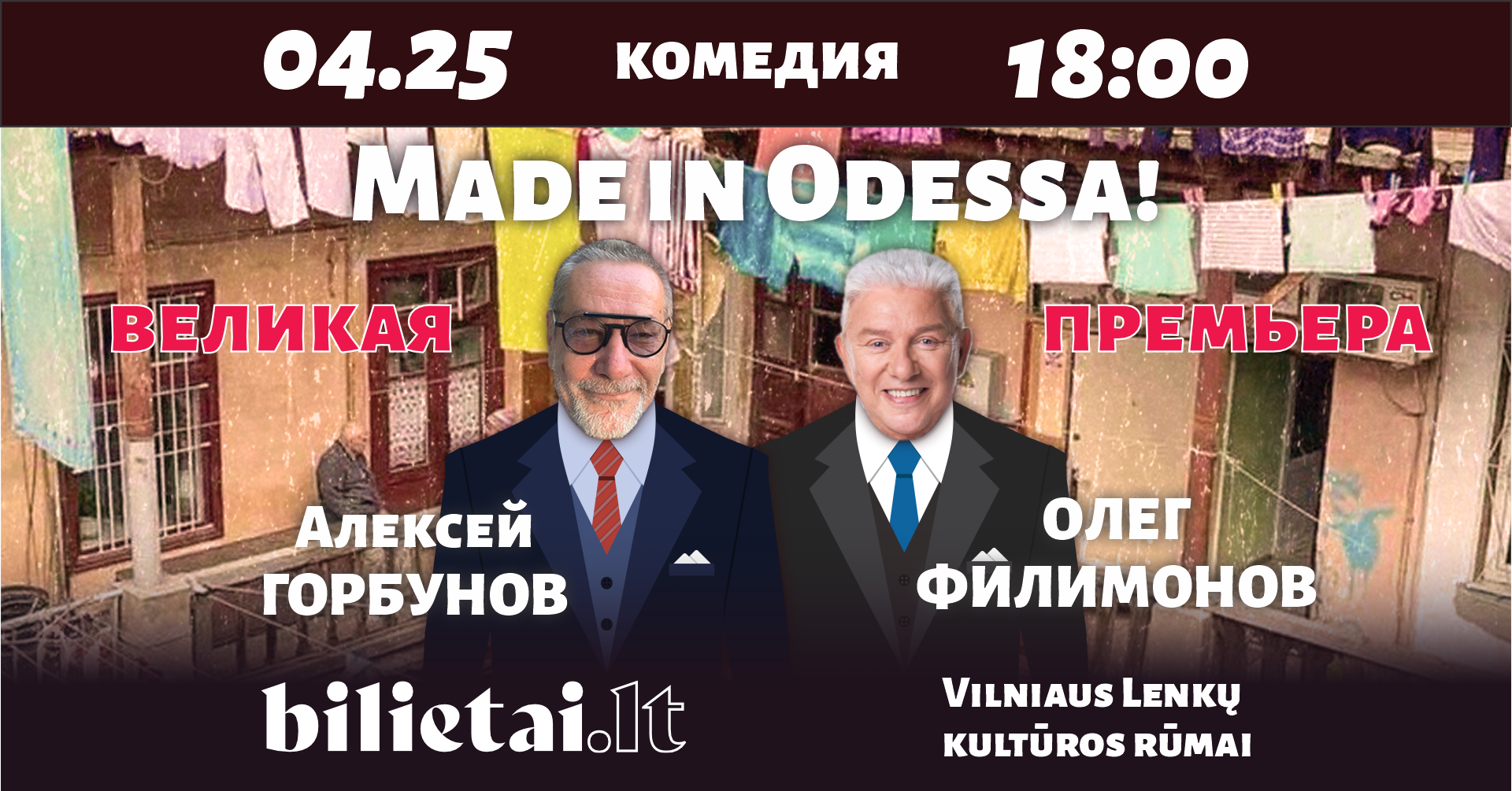 25 апреля в зале Дома полькой культуры два блистательных и харизматичных актёра: прекрасный Алексей Горбунов и непревзойденная звезда «Одесских джентльменов» Олег Филимонов порадуют, настроят на хорошее и смешное своим спектаклем «MADE in ODESSA» (спектакль - на русском языке)!