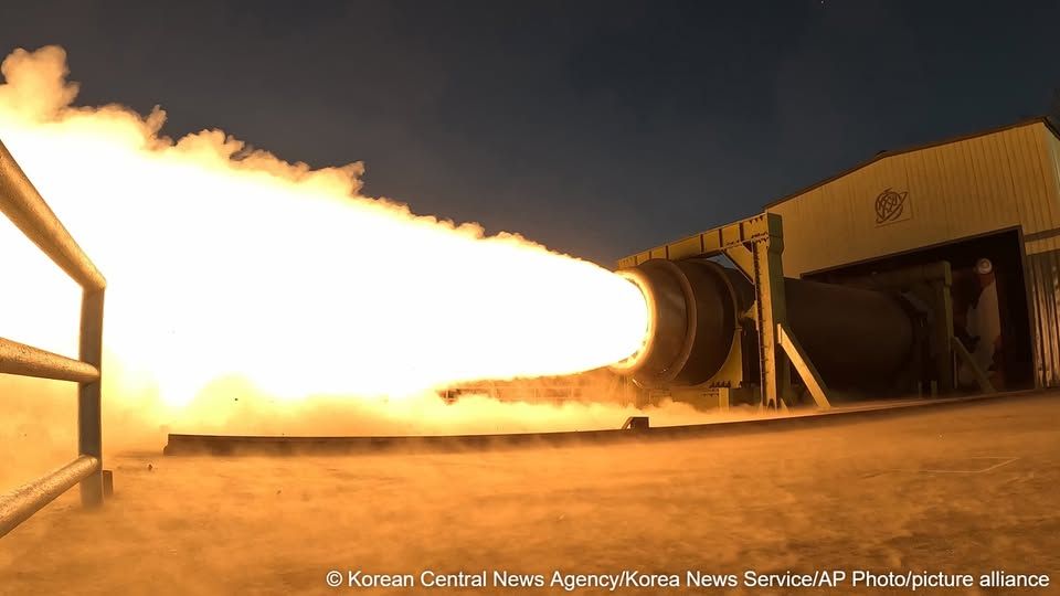 Проведение подобных испытаний демонстрирует "решимость Северной Кореи получить ракеты, способные поражать цели по всему миру", заявил агентству южнокорейский аналитик Хон Мин. На фото видно, как из установленного на земле двигателя вырываются языки пламени, освещая окружающий полигон оранжевым светом.