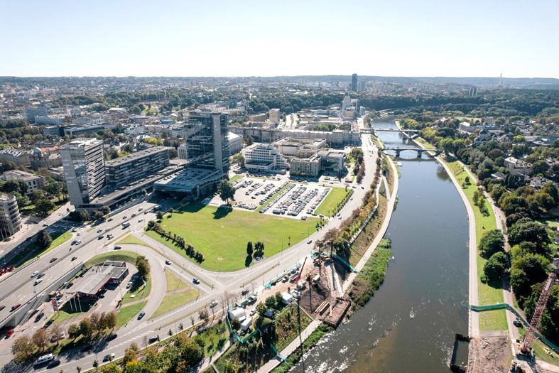 Помимо проектирования самого здания, перед архитекторами стояла задача создать привлекательное, инклюзивное и общедоступное пространство на берегу реки Нярис - у подножия строящегося нового пешеходного моста. Эта зона должна быть функционально и визуально совместима с общей концепцией развития набережной реки Нярис и окрестностей Конгресс-центра.