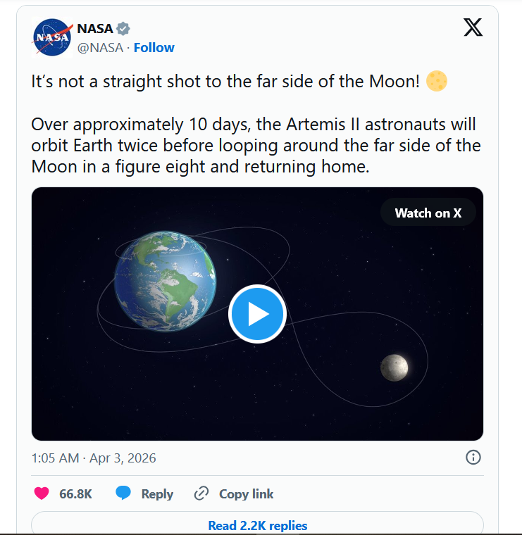 Запуск космического корабля "Орион" в рамках лунной миссии "Артемида-2" состоялся 1 апреля в 18:35 по времени Восточного побережья США с мыса Канаверал во Флориде. Его экипажу предстоит за 10 дней совершить облет Луны и вернуться на Землю без посадки на лунную поверхность. Спутник Земли находится на расстоянии почти 400 000 километров от нее. Предыдущий полет на Луну состоялся более 50 лет назад, 7 декабря 1972 года, на космическом корабле "Аполлон-17".