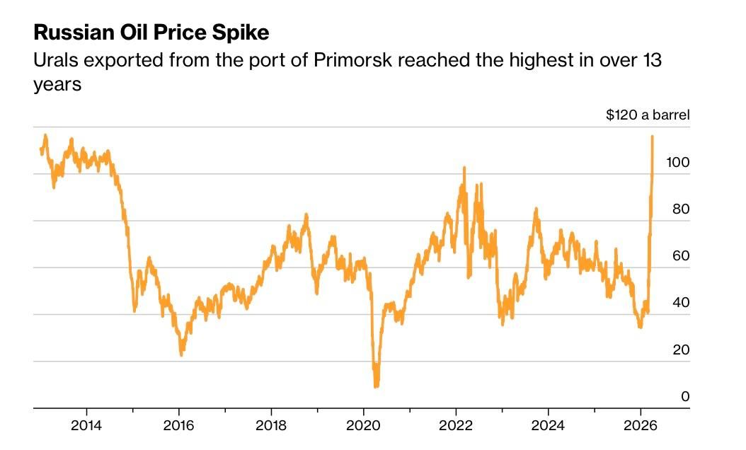 Цены на российскую нефть продолжают стремительно расти из-за перекрытого Ормузского пролива, через который осуществлялось около четверти мировых поставок нефти. Как сообщает Bloomberg (https://www.bloomberg.com/news/articles/2026-04-07/war-in-iran-drives-russian-oil-prices-to-a-13-year-high) со ссылкой на данные Argus, стоимость барреля сорта Urals в балтийских портах РФ в конце прошлой недели достигла $116,05 за баррель - рекордного уровня по меньшей мере за последние 13 лет.