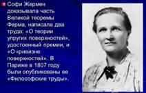 Жермен с помощью изящного рассуждения, доказала, что если уравнение x^n + +y^n = z^n имеет решения для таких простых n, что 2n+1 также простое число, то либо x, y, либо z делится n.