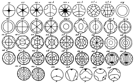 Фигуры Хладни образуются, когда поверхность, покрытая песком, начинает вибрировать. Песчинки собираются вдоль линий с наименьшей амплитудой вибраций. Софи Жермен внесла важный вклад в математическую теорию, объясняющую эти фигуры. Иллюстрация воспроизведена по изданию 1809 года работы Эрнста Ф. Хладни