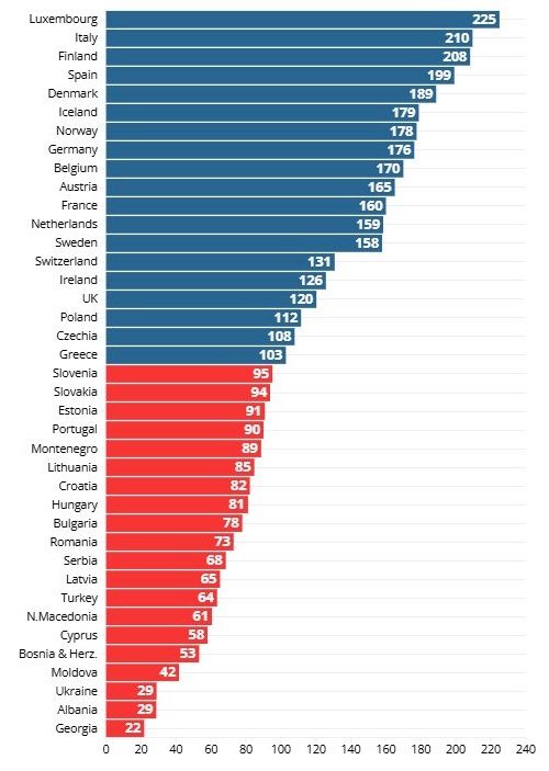 В 39 европейских странах, включая членов ЕС, страны-кандидаты, страны Европейской ассоциации свободной торговли (ЕАСТ) и Великобританию, соотношение пенсий к прожиточному уровню колеблется от 22% в Грузии до 225% в Люксембурге.