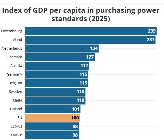 В 2025 году ВВП на душу населения в пересчете по паритету покупательной способности сильно различается по Европе. Каждый третий житель ЕС живет в стране, где этот показатель выше среднего по Союзу.