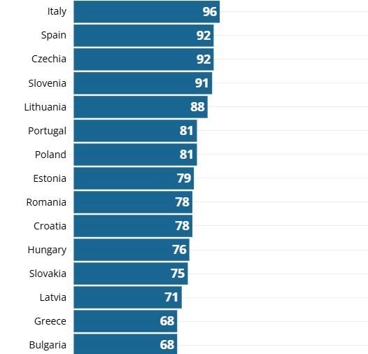 Близко к этому уровню находятся Польша и Португалия, где показатель составляет по 81 % от среднего по ЕС.