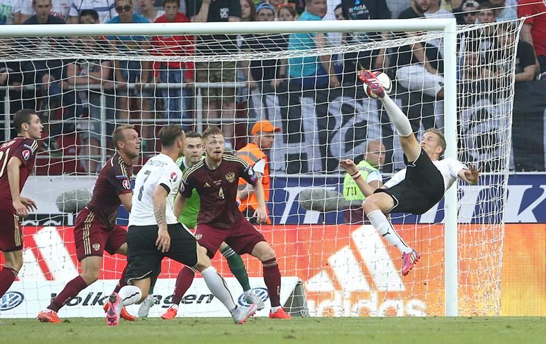 Из других результатов стоит отметить очередную неудачу российских футболистов, после которой у первых чемпионов Старого континента появился реальный шанс пролететь мимо европейского первенства, так как напрямую в финальную часть чемпионата выходят лишь две команды из группы. Единственный гол в матче в акробатическом прыжке через себя забил австриец М.Янко (на снимке).