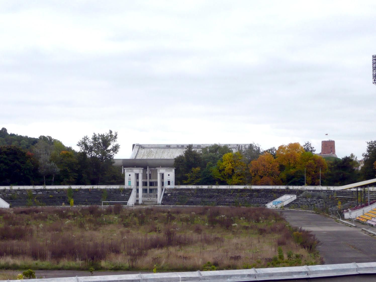 С возвышенности же открылся, как и ожидалось, удручающий вид: превращающееся в лесок футбольное поле, разрушающиеся трибуны, а на заднем плане, чуть справа (взгляните на снимок), самый знаменитый, пожалуй, символ Вильнюса и Литвы – башня Гядиминаса.