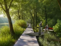Территорию вокруг двух прудов в центре микрорайона Салининкай планируется превратить в парк для отдыха и изучения природы. На участке между двумя школами планируется проложить удобные пешеходные дорожки, установить понтонные террасы на воде и образовательные тропы в лесу, а также создать отдельную игровую площадку для детей и луг для общественных собраний.