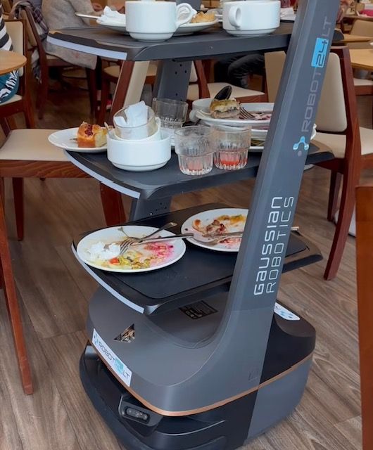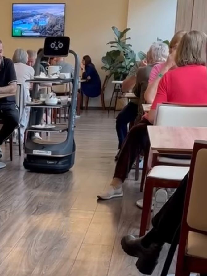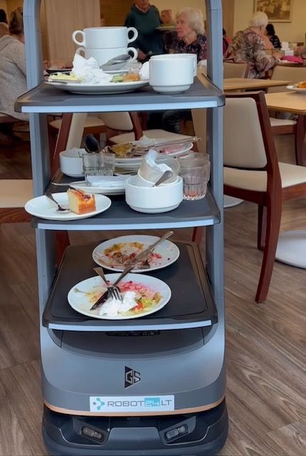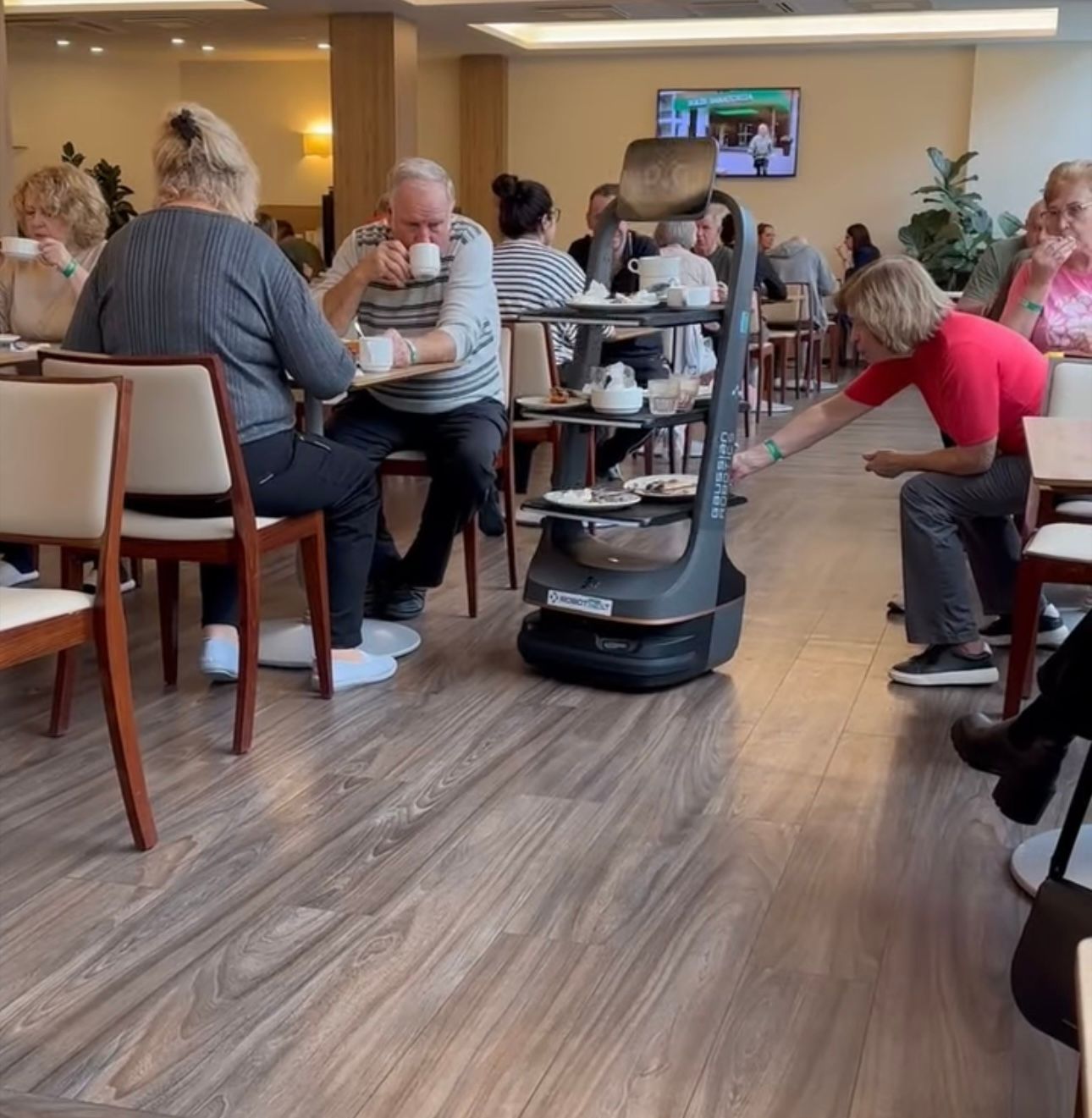 Отдыхающие в санатории «Eglė» курортного города Бирштонас приятно удивлены обслуживающим их роботом, который собирает грязную посуду после еды.